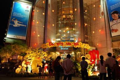 Mọi người đi ngắm phố đêm dừng chân ghi ảnh trước cảnh trang trí ở tiền sảnh của Sài Gòn Centre – Ảnh: KH.NGỌC